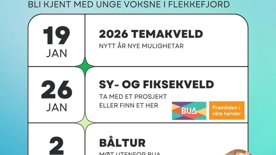 Flekkefjord Social Club Aktivitetskalender for Flekkefjord Social Club i januar og februar. Publisert 15.01.2026 kl. 08.54