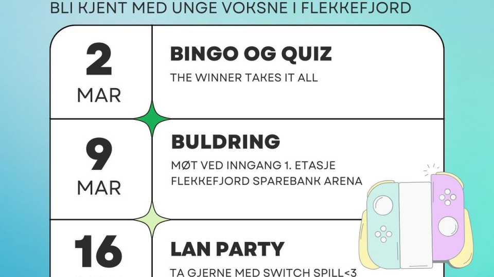 Flekkefjord Social Club - Aktiviteter i mars Et fellesskap for tilflyttere og unge voksne som vil bli kjent med nye folk og skape noe fint sammen. Kreative, aktive og sosiale mandagskvelder for u... Publisert 24.02.2026 kl. 08.17