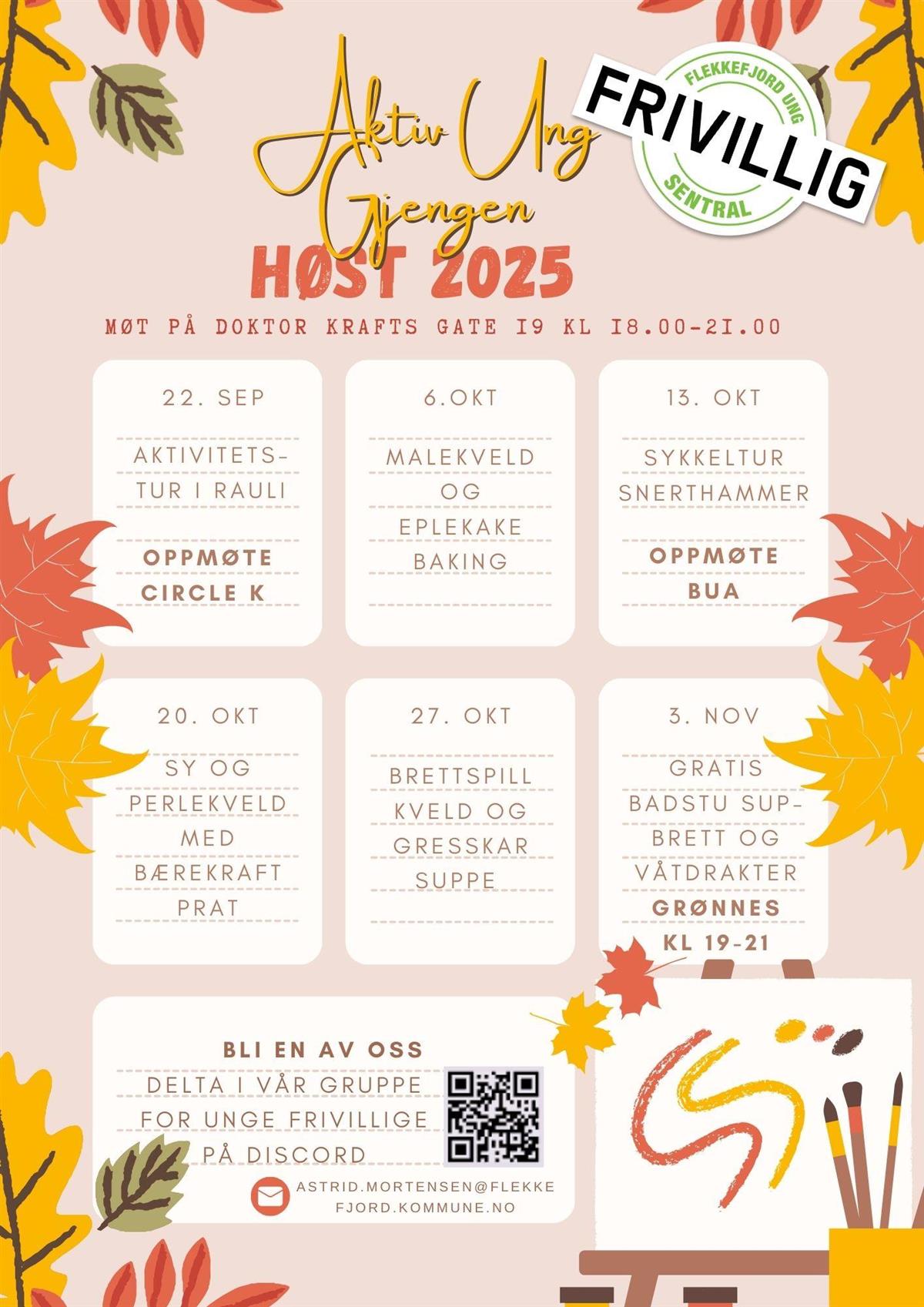 Hold deg oppdatert på tilbudet gjennom Aktiv Ung sin hjemmeside Flekkefjord Frivilligsentral Aktiv Ung. Der kan en også finne andre tilbud.