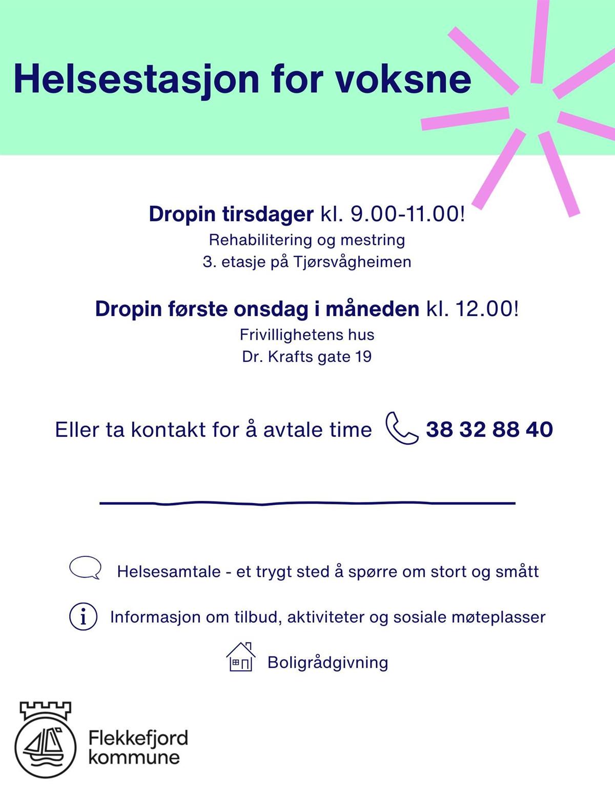 Helsestasjon for voksne og eldre er et helsefremmende og forebyggende tilbud til deg som hjemmeboende pensjonist. Her kan du få en uforpliktende samtale om din helse og livssituasjon, samt hva du ønsker og har behov for inn i alderdommen. Tilbudet skal bidra til at du kan føle deg trygg og bo hjemme så lenge du ønsker det.