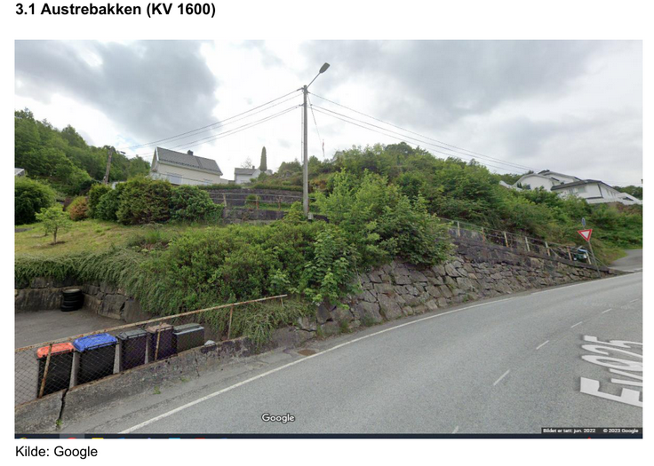 Dagens forstøtningsmur må støpes på nytt, og det skal settes opp nytt kjøresterkt autovern. Det kan også bli aktuelt å utvide prosjektet for å gjøre bakken slakere, men da må kommunen kjøpe litt grunn fra gnr. 203 bnr. 618 (grunneier er positiv). Her kan tiltaket samkjøres med vann- og avløpsarbeid for å gi mer verdi totalt.