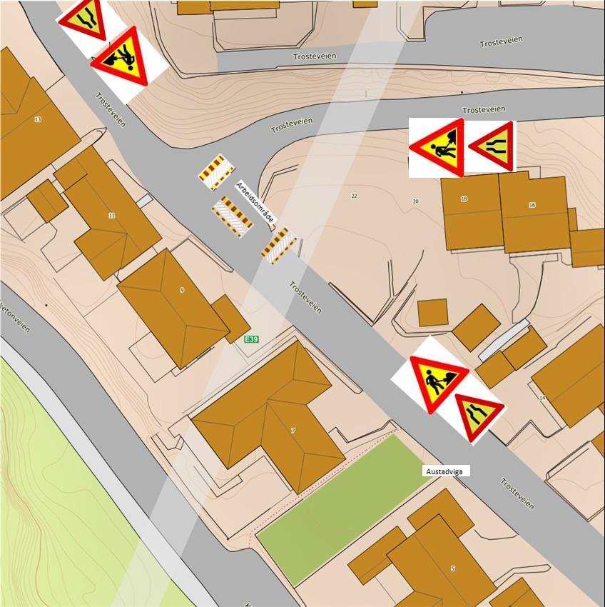 Arbeid i TrosteveienDet arbeides i Trostveien. Veien er åpen for trafikk.Det utføres arbeid i Trosteveien i perioden 11. februar til 11. april.Veien vil være åpen for trafikk.
