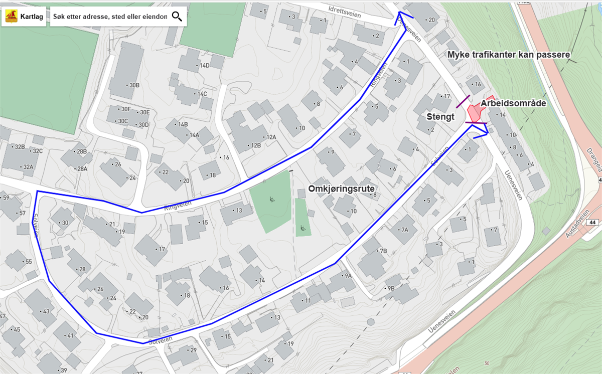 Uenesveien periodestengtUenesveien er i perioder stengt på grunn av vedlikehold av VA-anlegg.Uenesveien er i perioder stengt ved Uenesveien nr. 14 fra torsdag 12. mars til 1. april.