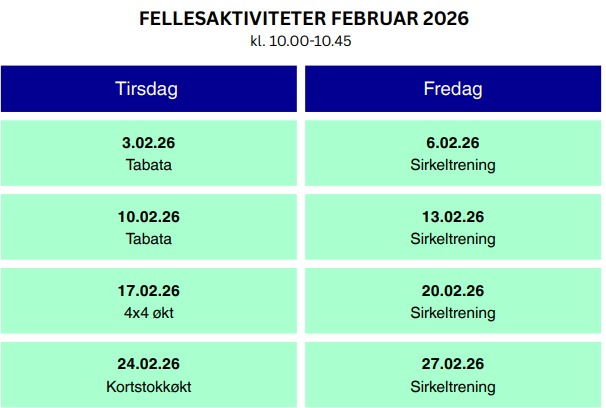 Åpen hallÅpen hall er et lavterskel aktivitetstilbud og sosial møteplass for folk i alle aldre. Det er ingen påmelding og man kan komme og gå som man vil. Tilbudet er gratis.Tirsdager og fredager kl. 09.45-12.00Flekkefjord Sparebank Arena. Oppmøte i sosialt rom, 3. etasje, ved fotballhallen.Hva skjer i åpen hall?AktiviteterFellesaktivitetKl. 10-10.45. Styrke-/kondisjonstrening med fysioterapeut i gruppe. Padel og squashKl. 10-12.00. Book tid i sosialt rom.StyrkeromKl. 11.00-12.00 (gjelder uke 2-6). Egentrening i styrkerom.Egenaktivitet og lek i fotballhallenVi har en egen handlekurv med leker/spill du kan benytte.BuldreromPå forespørsel. Spør ansatte i 3. etasje.ServeringVi serverer kaffe, te, smoothie og nøtter i sosialt rom i 3. etasje.Program for fellesaktivitetVil du holde deg oppdatert om Åpen hall?Meld deg inn i gruppen «ÅPEN HALL Flekkefjord» på Facebook!Hvor finner du oss?Flekkefjord Sparebank Arena. Oppmøte sosialt rom i 3. etasje, ved siden av fotballhallen.Av hensyn til brannsikkerhet må alle besøkende i Åpen hall skrive seg på liste i 3. etasje ved ankomst, og krysse seg av før man går.Adresse: Tunveien 46, 4400 Flekkefjord.